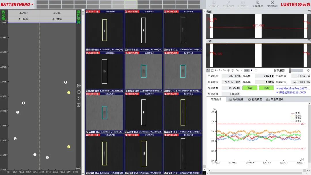 針對(duì)鋰電檢測(cè)過程中的這類痛點(diǎn),凌云光推出的鋰電池極片檢測(cè)方案,能實(shí)現(xiàn)涂布區(qū)、陶瓷區(qū)、留白區(qū)的同時(shí)檢測(cè),保證了漏箔和針孔嚴(yán)重缺陷的檢出,還能實(shí)現(xiàn)褶皺、暗痕等低反差缺陷的檢出。缺陷清晰呈現(xiàn),對(duì)比明顯,同時(shí)兼容正負(fù)極檢測(cè)。