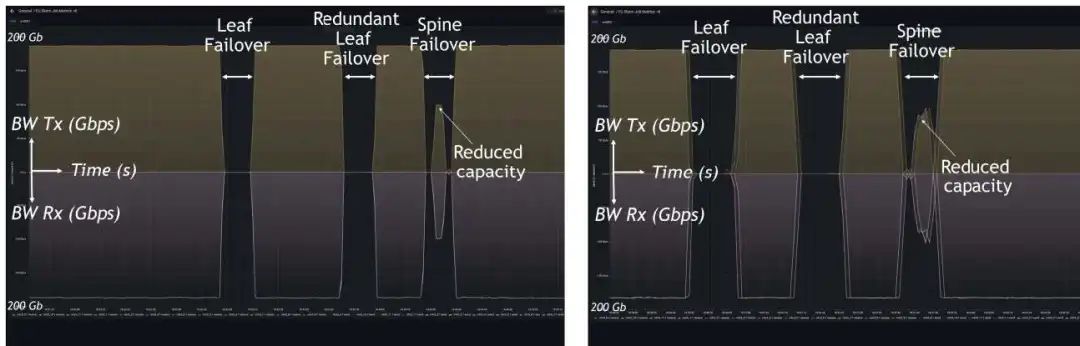 圖2顯示了我們對UCX和NCCL集體通信庫的測試結(jié)果。在該測試場景中,進(jìn)行了IB交換機(jī)故障模擬。圖表顯示了實(shí)驗(yàn)中涉及的一個(gè)DGX的IB界面上的帶寬(y軸)隨時(shí)間(x軸)的變化,對于all-to-all和all-reduce的微基準(zhǔn)測試?;鶞?zhǔn)測試在4個(gè)DGX之間和接口之間產(chǎn)生相同的流量。我們運(yùn)行微基準(zhǔn)測試,模擬故障,并監(jiān)控隨著時(shí)間的推移應(yīng)用程序的性能和狀態(tài)。在Spine故障期間,由于活動(dòng)鏈路的減少,系統(tǒng)的容量會降低,但應(yīng)用程序有可替代路徑可用,不會崩潰。啟用彈性方案后,可以在幾秒鐘內(nèi)恢復(fù)群集的全部性能(Spine故障切換)。在Leaf層發(fā)生故障(Leaf failover)的情況下,應(yīng)用程序崩潰,受影響的IB接口將保持離線狀態(tài),直到問題解決。啟用彈性方案后,應(yīng)用程序在中斷幾秒鐘(目前約為7秒,但有待優(yōu)化)仍能繼續(xù)運(yùn)行,系統(tǒng)的全部容量也能夠恢復(fù)。