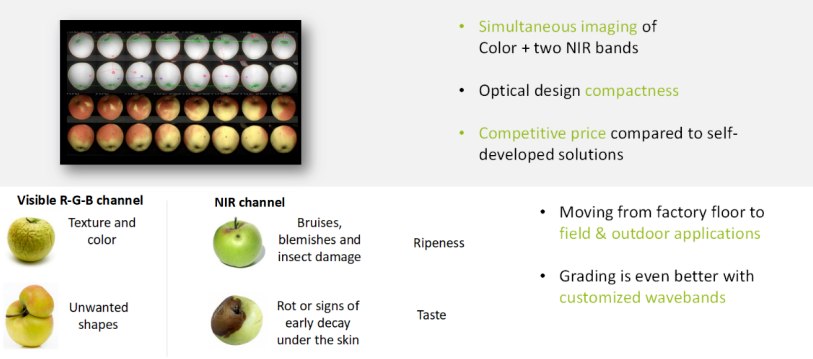 如何突破這一技術(shù)瓶頸?答案在JAI多光譜相機(jī),憑借棱鏡技術(shù),通過雙波段檢測,保障產(chǎn)線高速檢測外表損傷的同時(shí)檢出水果內(nèi)部腐壞等情況。