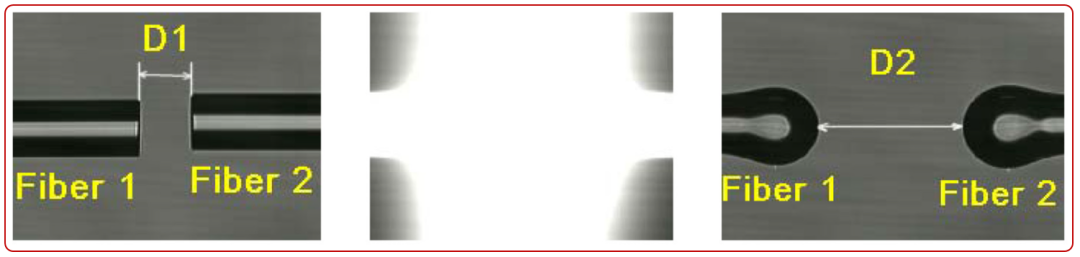 圖2▲從左至右:電弧放電前、電弧放電、電弧放電后。偏移熔接法放電功率校準(zhǔn),光纖1和光纖2是相同的光纖類型,通過(guò)測(cè)量光纖軸上d1-d2偏移變化量,該方法僅適用于直徑為125um的通信光纖。