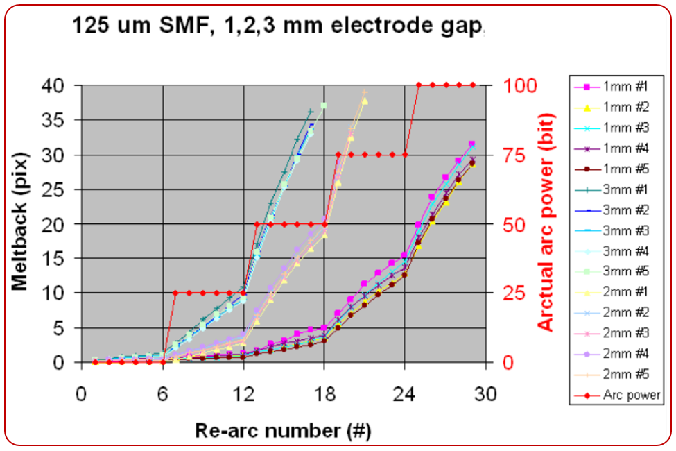 從圖6所示的示例中,可以看到使用前面描述的新放電校準(zhǔn)方法,125、220和400um光纖可以在不同的電弧大小設(shè)置下用相同的電弧功率設(shè)置進(jìn)行熔接。換句話說(shuō),在不同光纖類型和電弧大小設(shè)置(電極間隔)條件下,操作人員可以很容易的得到所需的熔接結(jié)果,對(duì)于任何新型或未知類型的光纖,工程師可以輕松的使用相同的功率設(shè)置調(diào)整熔接參數(shù),無(wú)需繁瑣地尋找合適的放電功率。