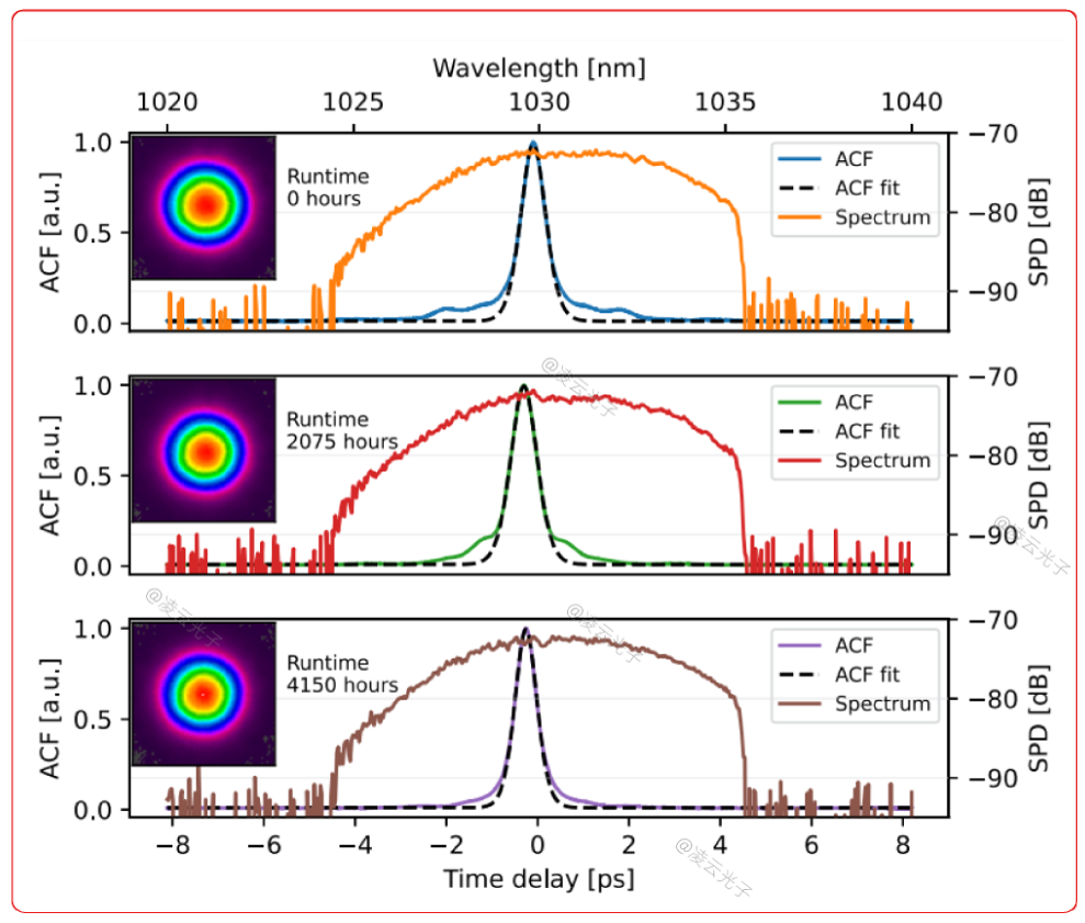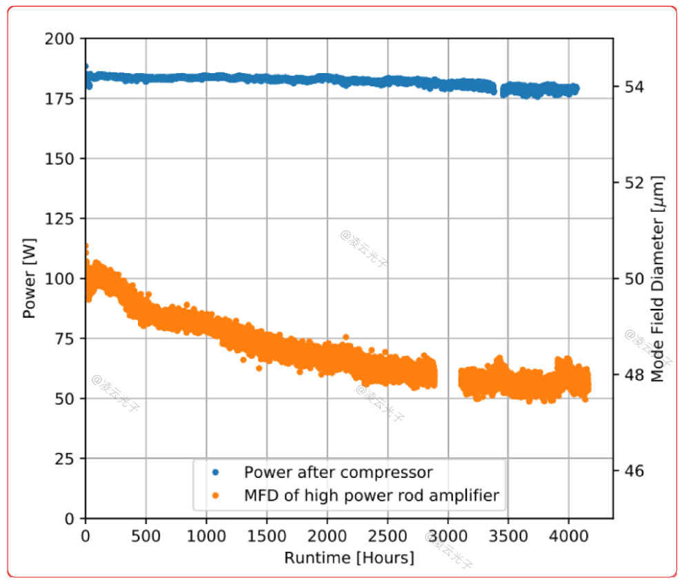 包括前端、功率放大器和壓縮器在內(nèi)的整個CPA系統(tǒng)的長期穩(wěn)定性已連續(xù)測試超過4000小時,TMI是隨時間累積的光子暗化的函數(shù),導致纖維中沉積的熱量增加,從而降低了TMI閾值[16,17]。在[16]中,PD過程的熱負荷貢獻占總熱負荷的50%以上,這不能僅從短期試驗中觀察到。