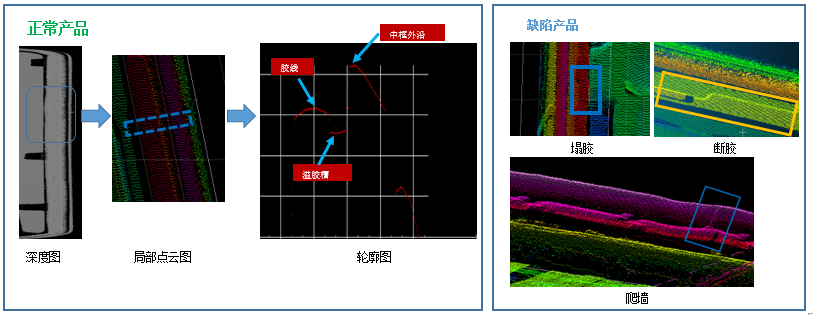然而,要在點膠的同時對膠路進(jìn)行檢測也面臨了難題,因為透明的膠水無法成像。為此,凌云光工程師們重建了3D成像光路并引入智能識別算法,考慮到透明、半透明、高反光輔材等膠水的成像性質(zhì),讓系統(tǒng)更具兼容性。