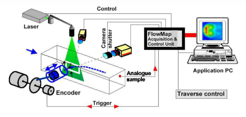 一種瞬態(tài)、多點、無接觸式的流體力學(xué)測速方法,通過在流場中均勻散播示蹤粒子,利用激光光源照亮所要測試的流場區(qū)域,實時記錄粒子圖像幀序列,根據(jù)圖像序列中兩幀之間的時間間隔,計算出兩幀圖像上相應(yīng)粒子的位移大小和運動方向,從而獲得測量流場的瞬時速度矢量圖。相機每接收一個觸發(fā)信號,拍攝兩幀圖像,第二幀圖像采集同時讀出第一幀圖像。
