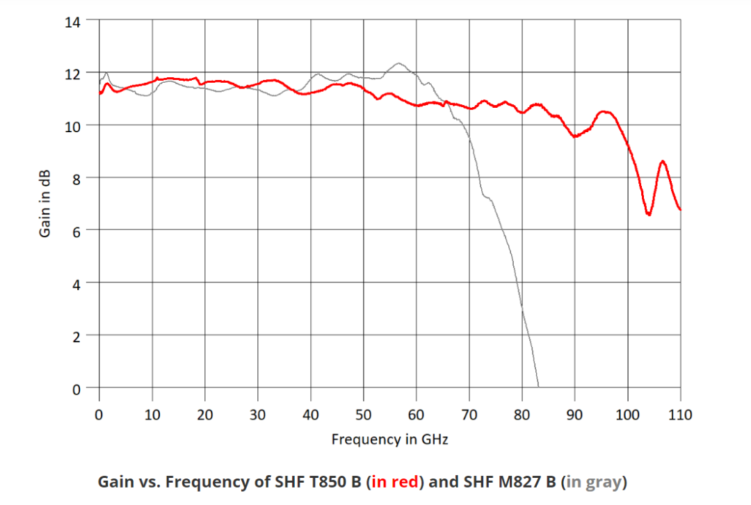 為了解決這個(gè)難題,SHF將于2023 OFC正式推出新款劃時(shí)代產(chǎn)品——100GHz超寬帶線性放大器SHF T850B ,其可提供3dB帶寬從<100kHz到>100GHz的超帶寬放大性能,可全面支持100GBaud下NRZ以及PAM4信號(hào)的放大需求。其帶寬性能較上一代70GHz 放大器 SHF M827 B提升40%以上。其S21對比測試圖如下: