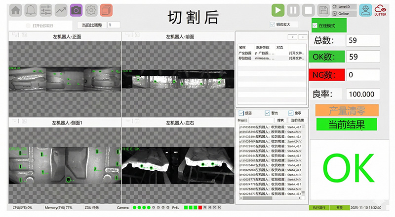 凌云光推出熱成型切割視覺檢測(cè)方案,采用雙6軸機(jī)械臂搭載定制2D+3D成像模組,以“視覺+AI+自動(dòng)化”協(xié)同技術(shù),實(shí)現(xiàn)70余種零件切割前后的全流程高精檢測(cè)。切割前,檢測(cè)放置偏位與浮高翹曲,防止激光頭撞機(jī);切割后,實(shí)時(shí)檢出未切透、漏切、孔位偏差等缺陷,杜絕批量問題流出。方案支持固定工位與隨線在線全檢兩種部署方式,已成功應(yīng)用于國(guó)內(nèi)頭部汽車廠商多車型混線生產(chǎn)。