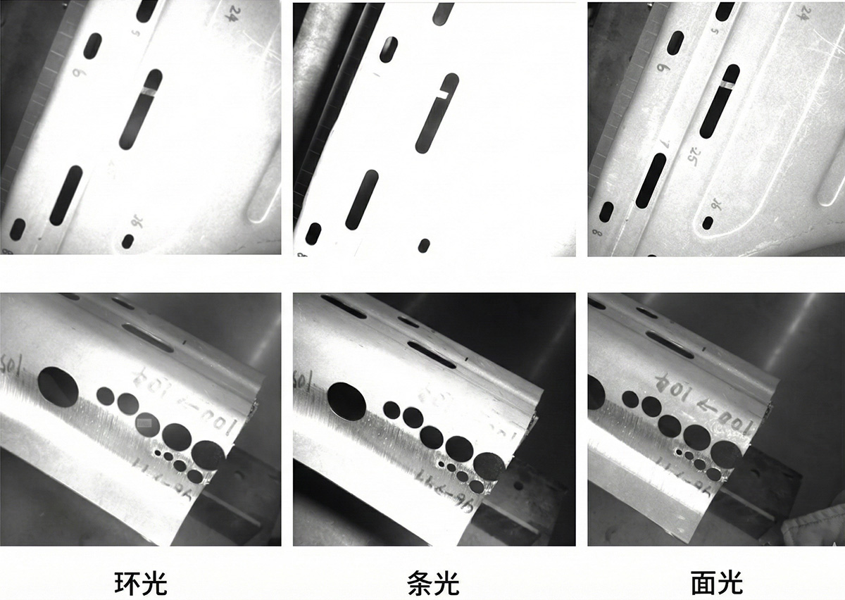 工件(吸能盒、加強(qiáng)板)表面高反光,傳統(tǒng)成像易造成過曝和陰影干擾導(dǎo)致誤報(bào)(如孔內(nèi)廢料和切割粘連易混淆)。方案特別定制四分區(qū)AOI光源實(shí)現(xiàn)均勻照明,精準(zhǔn)檢測(cè)圓孔、方孔、異形孔、裙邊尺寸、主副孔位置關(guān)系等,精度達(dá)0.1mm,顯著降低過檢報(bào)錯(cuò)與批量質(zhì)量風(fēng)險(xiǎn)。