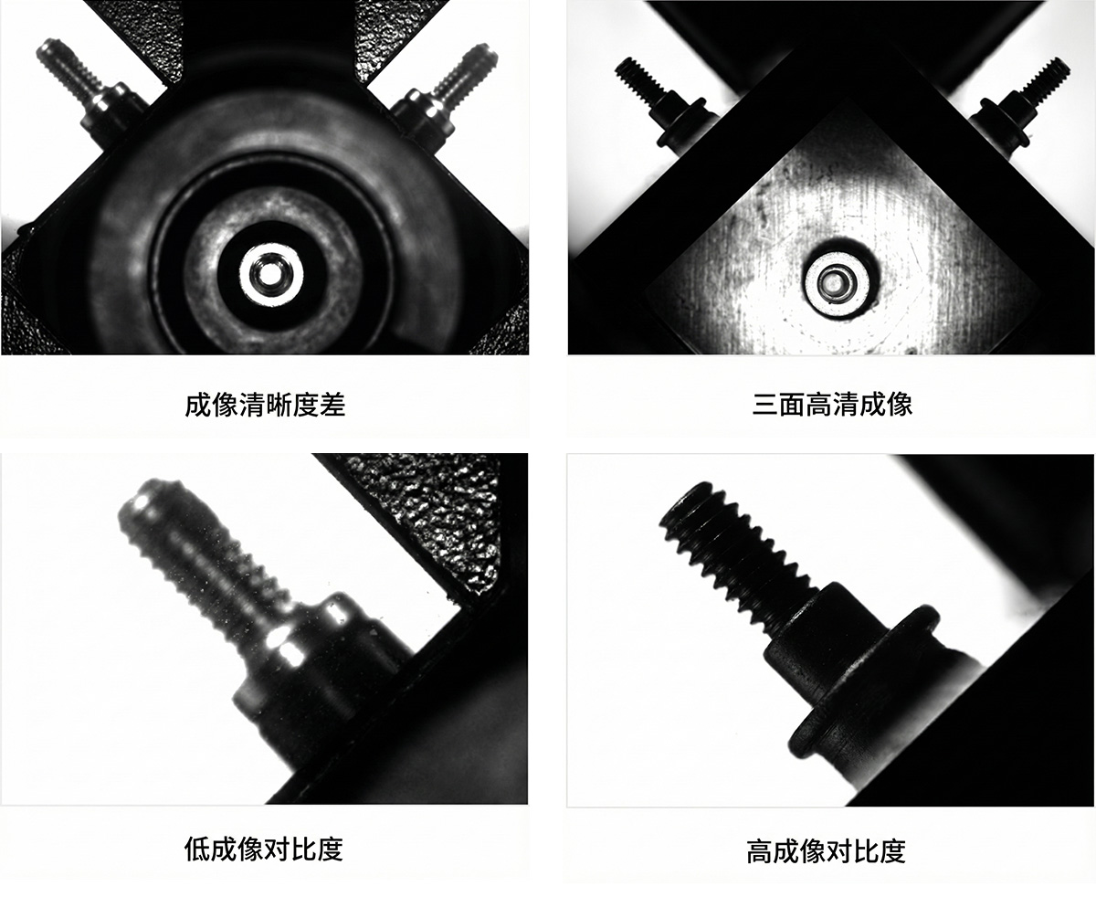 多棱鏡光路及光闌設(shè)計(jì),實(shí)現(xiàn)一次曝光同步完成正面與雙側(cè)面清晰成像,減少因視角盲區(qū)或成像模糊導(dǎo)致的測(cè)量誤差,從而降低漏檢風(fēng)險(xiǎn)。在鏡面反光、復(fù)雜螺紋或膠水殘留等特殊工況下,成像對(duì)比度高,關(guān)鍵細(xì)節(jié)特征清晰可判。